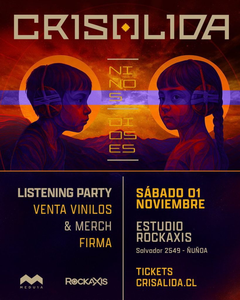 El próximo sábado 1 de noviembre a las 20:00 hrs., la reconocida banda chilena Crisálida celebrará una jornada única con un. Listening party de su última placa de estudio. “Niños Dioses”, un encuentro pensado para disfrutar la música desde la cercanía y la experiencia del formato vinilo. La cita será en Casa. Rockaxis, un espacio íntimo y acogedor que reunirá a los seguidores del grupo en torno a un ambiente de conversación, sonido y experiencia.
